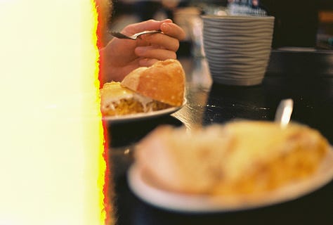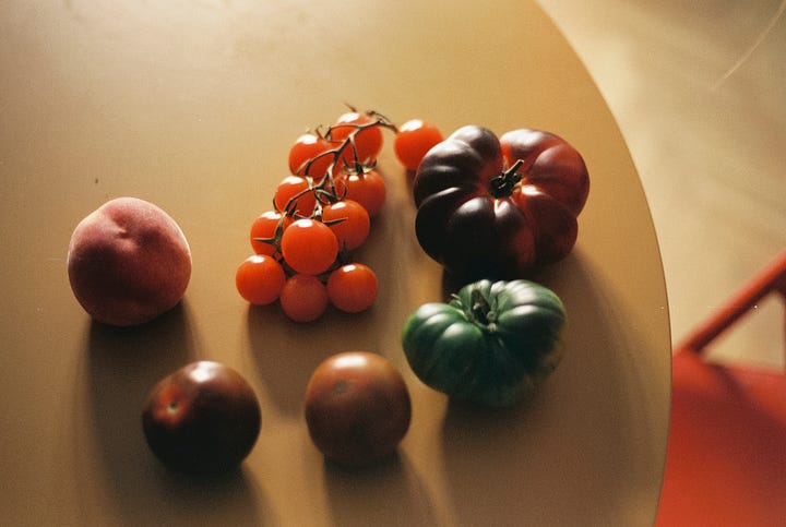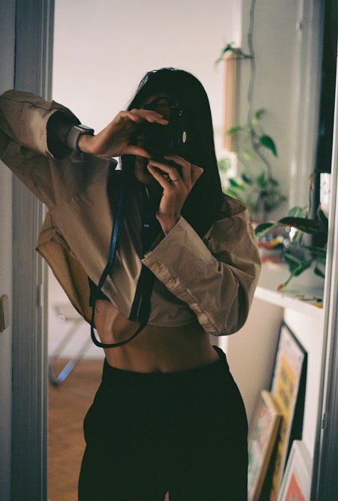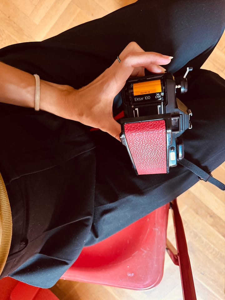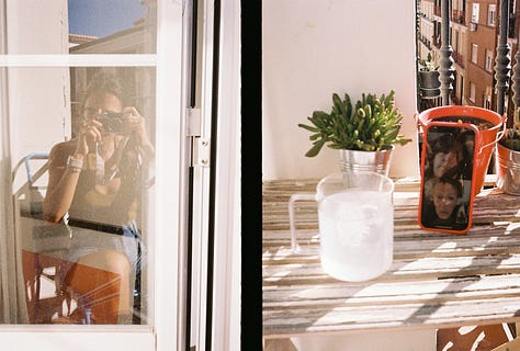 Estando de viaje me llegó el mail con las fotos ya digitalizadas. Las miré. Algunas estaban desordenadas cronológicamente (me pregunto si cortarán el carrete en tramos y tal vez por eso las mandan en distinto orden). En el medio estaban las últimas fotos veladas. Mientras escribo esto, me auto interrumpo para volver a ver las fotos de ese carrete. Sonrío porque las fotos veladas no son fotos blancas: las miro y sé que atrás estamos nosotras. A veces, cuando me quedan pocas fotos para terminar el carrete, me agarra un poco de ansiedad y disparo fotos a cualquier recorte dentro de mi casa para terminarlo y llevarlo a revelar. Generalmente son las fotos que más me gusta. Supongo que es porque no espero nada. También porque los vermuts en el banco y los tomates en mi mesa fueron en San Isidro después de chocarme a Simón. Sacar una foto a veces me genera una mini dicotomía de “si saco la foto no estoy disfrutando el momento” pero en realidad sí: no sólo analizo el pedacito que elijo recortar, sino que al verlo después en el papel me lleva instantáneamente a ese lugar. Aunque sea una foto quemada al final del carrete.