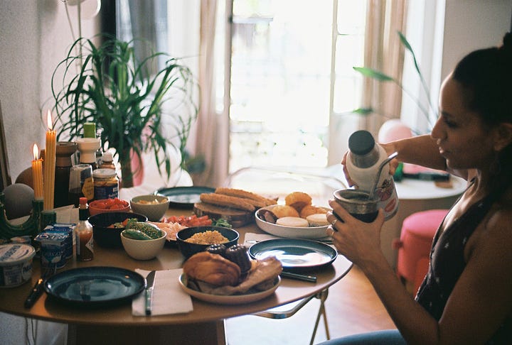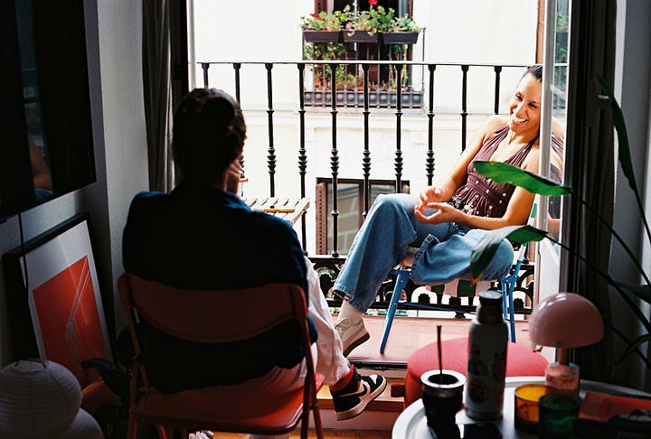 No se conocían. Supongo que alguna vez le conté a la otra alguna anécdota. Llegaron juntas. Empujaron la puerta de casa (que dejé entornada) y nos abrazamos. Tomamos mates y comimos salado-dulce-salado-dulce-dulce. Pasaron las horas y cambiamos la sobremesa al balcón. Llené el tercer termo con agua, cambié la yerba y saqué un platito con unas masitas y alfajores. En una de las idas y vueltas a la cocina vi a las chicas charlando y les saqué una foto con la analógica.