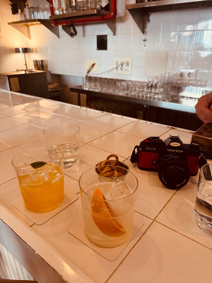 Entramos a Savas, nos sentamos en la barra, apoyé mi cámara que estuve paseando toda la tarde sin sacar una sola foto, y pedimos mis dos tragos favoritos. Cuando estábamos de camino le expliqué por qué era mi bar preferido, y uno de los motivos eran sus dueños. Nos pusimos a hablar a veces nosotras dos, y de vez en cuando con ellos sumándose a la conversación. Se liberó la mesa de la ventana y nos pasamos ahí. Le saqué un par de fotos a los vasos semi vacíos (que me gusta mucho más que lo recién servido, prolijo y no vivido) y una a ella. Me preguntó, apoyada sobre la barra, si podía sacarme una foto ahí, en la ventana.